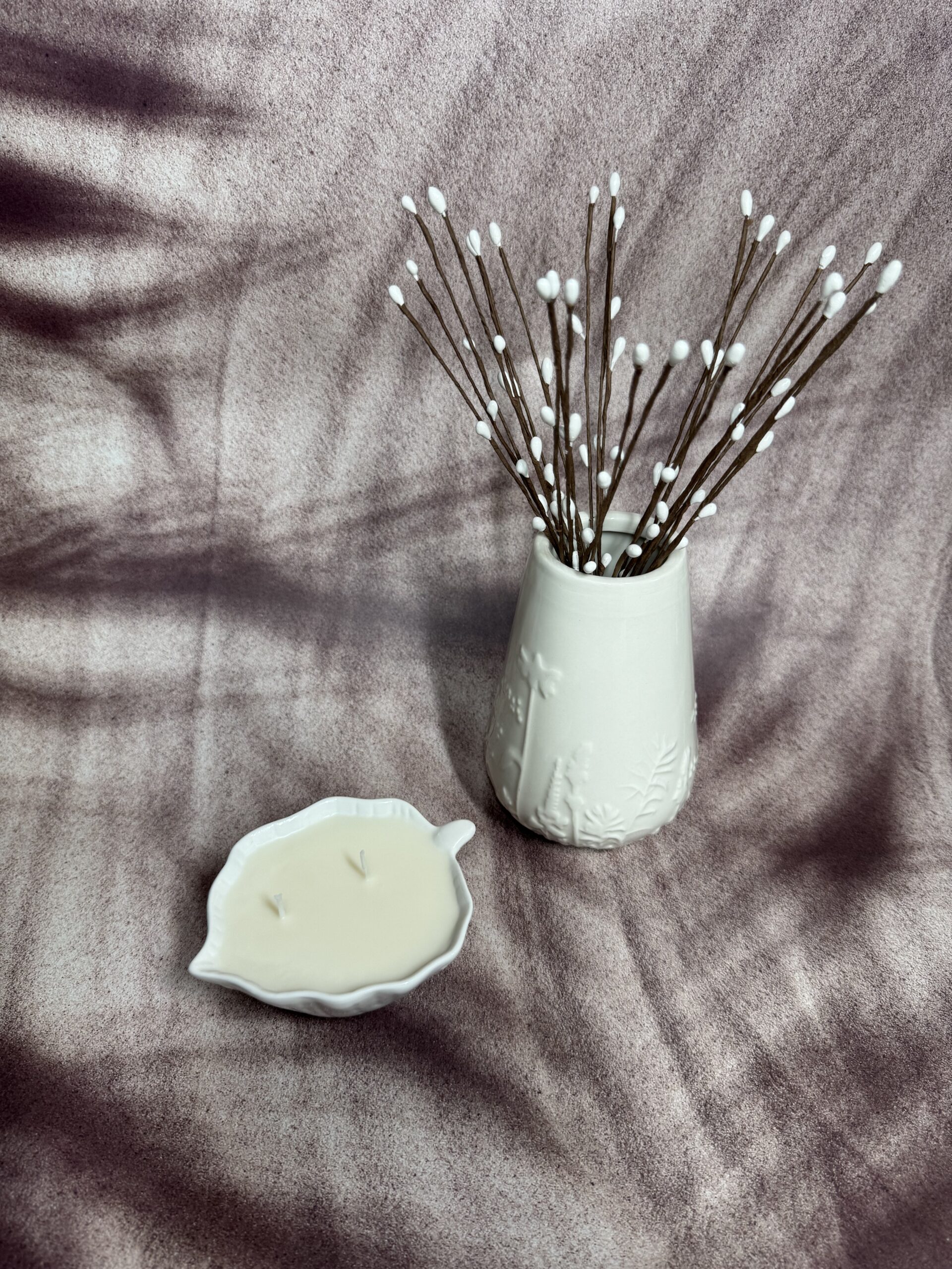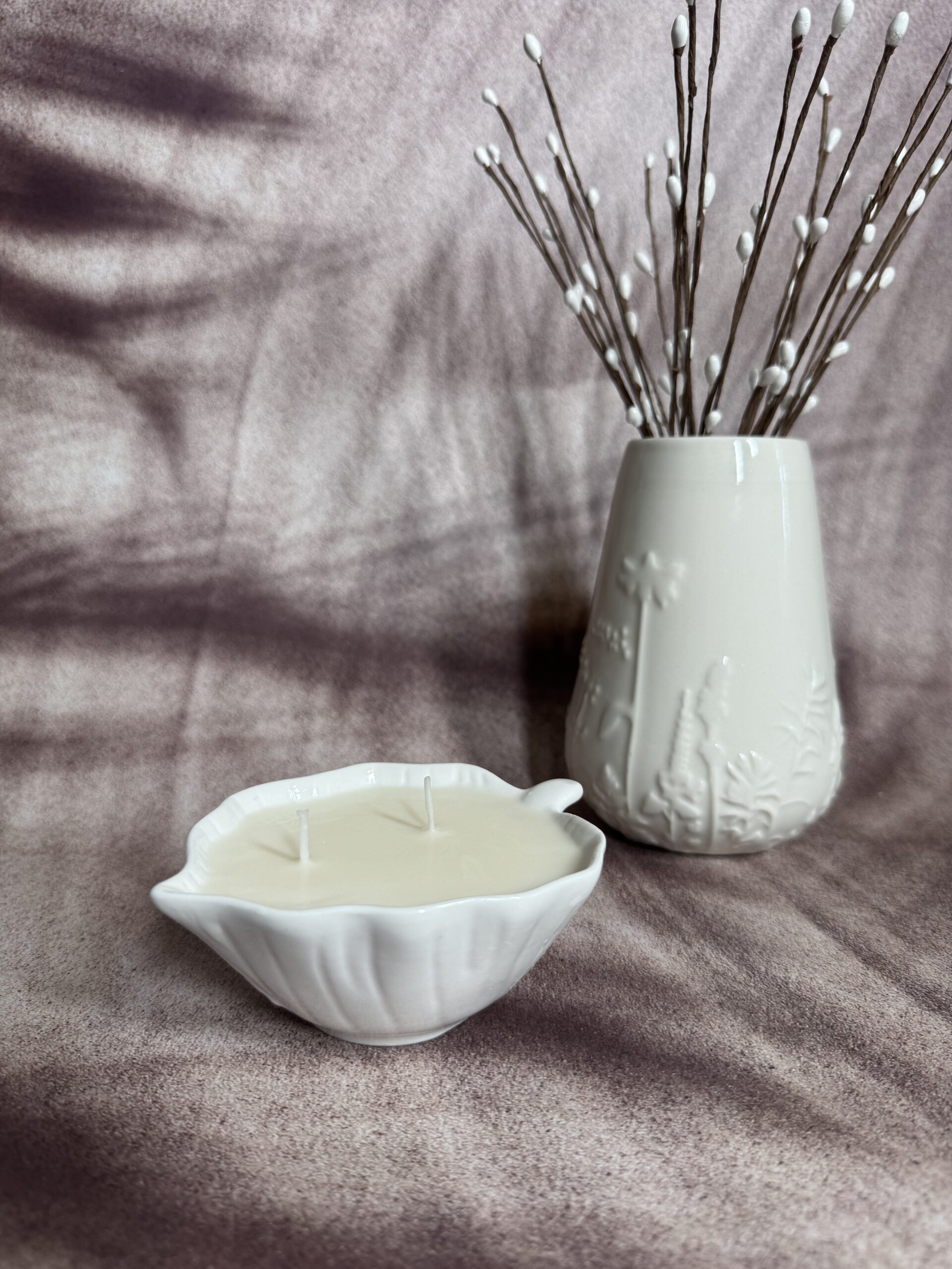 – Formă Naturală, Atmosferă Caldă Această lumânare parfumată este turnată manual din ceară de soia 100% naturală, într-un vas ceramic cu o formă organică ce amintește de o frunză sau petală. Cu două fitile, oferă o ardere uniformă și un parfum subtil, perfect pentru a crea o ambianță relaxantă și caldă.