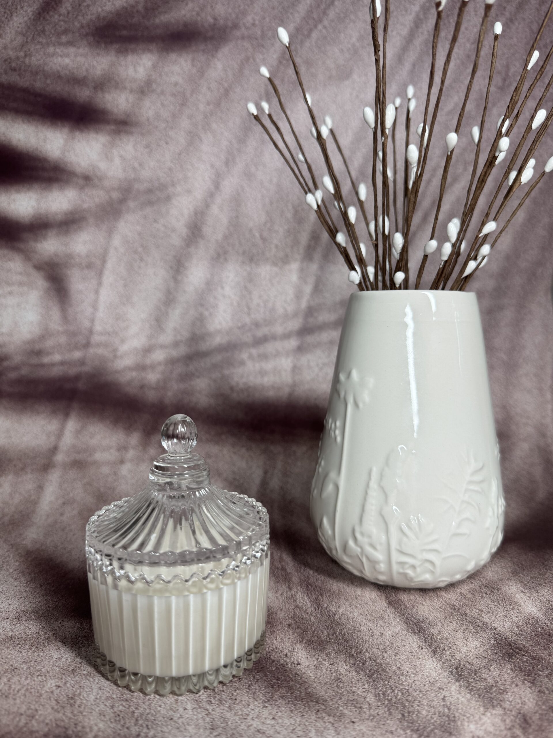Această lumânare parfumată este turnată manual din ceară de soia 100% naturală și prezentată într-o bombonieră elegantă din sticlă, cu capac. Un detaliu de decor care îmbină stilul clasic cu utilitatea – perfectă pentru a crea un colț de relaxare sau pentru a fi oferită în dar.
